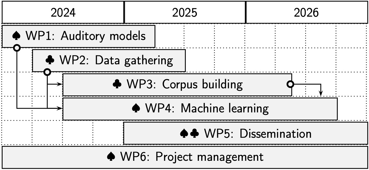 The leader of each WP is indicated by spade (♠) and club (♣) suits for Prof. Villegas and Prof. Lee, respectively. Machine learning, statistical modeling, and phonetics are fields where Prof. Villegas has substantial research experience. His team will be in charge of WP1, WP4, and WP6. Prof. Lee is an expert on phonetics and phonology of understudied languages with special interest in those where phonemic contrast is used. He will lead the activities of WP2 and WP3. Activities of WP5 will be collaboratively conducted by both groups.